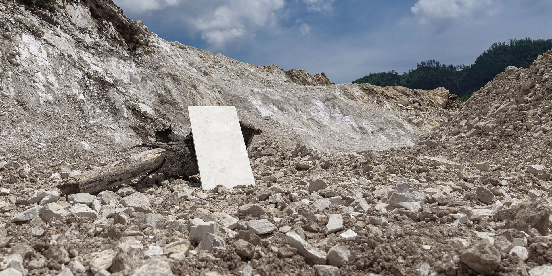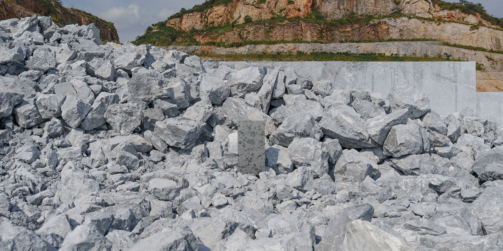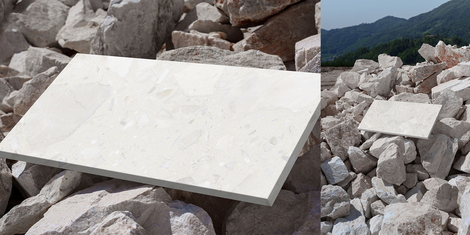 The white marble ore from Susong, Anhui is difficult to use for carving and is mostly employed as decorative slabs. However, with a yield of high-quality rough blocks of less than 10%, the mining process inevitably generates immense amounts of residual ore. Without appropriate means of utilization, this residue becomes ever-accumulating "waste." Dongpeng New Materials incorporates white marble remnants into product design, using oversized aggregates to reshape the elegant and noble artistic character of white marble stone, with a solid waste content of 69%.