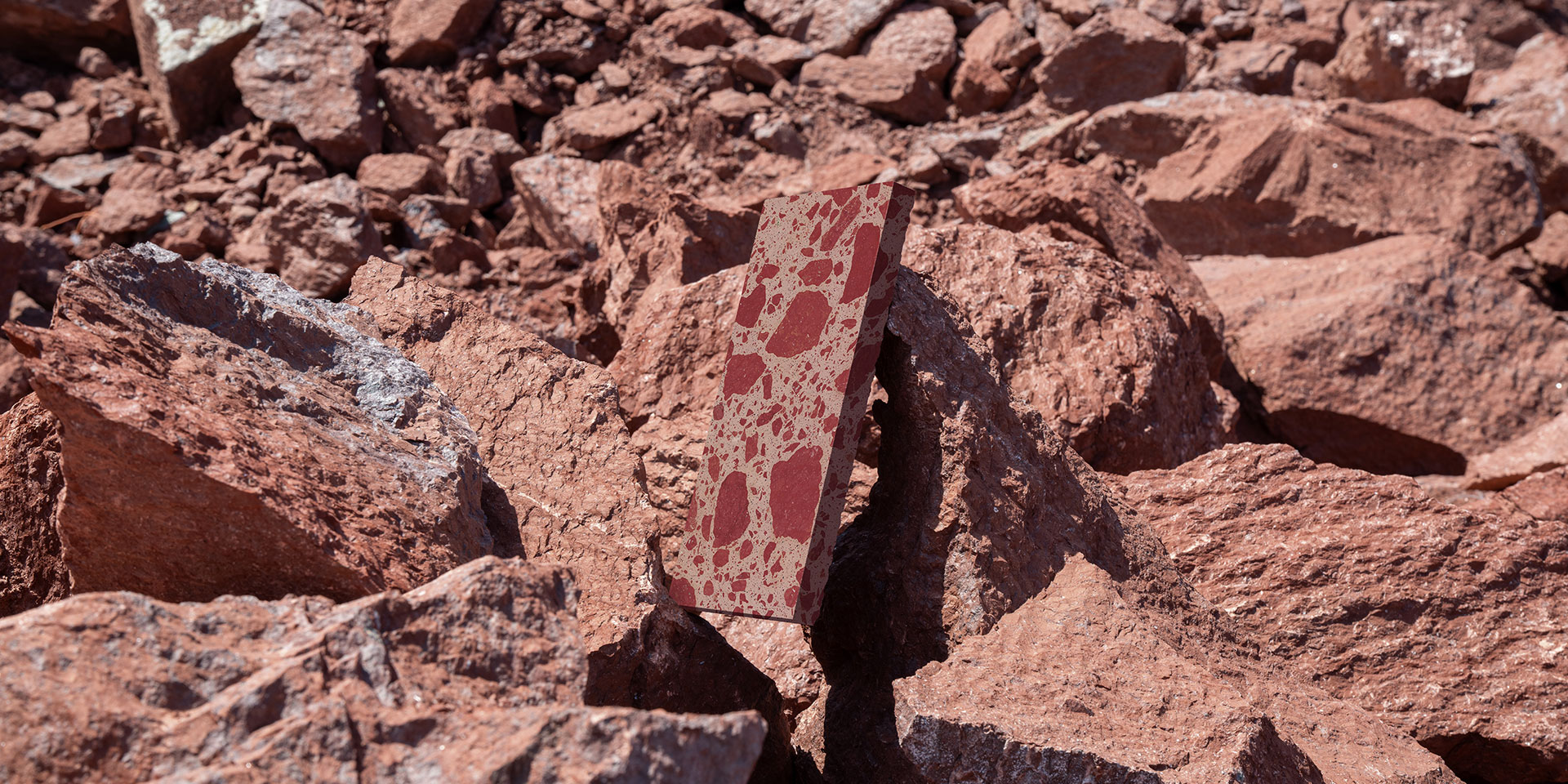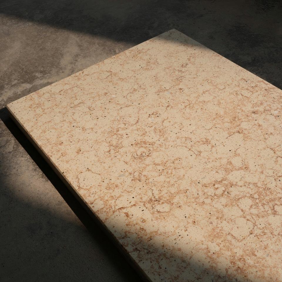 Petrified stone is a product of warm, humid climates and diverse geological conditions. In Pengze County, Jiangxi, there are petrified stone quarries of varying scales, whose extraction processes generate substantial amounts of scraps and waste. These residual materials scatter across fields, causing significant ecological impact. Dongpeng New Materials incorporates petrified stone remnants of different sizes into its products, using oversized aggregates to interpret the unique artistic tension of red petrified stone, with a solid waste content of 48%.